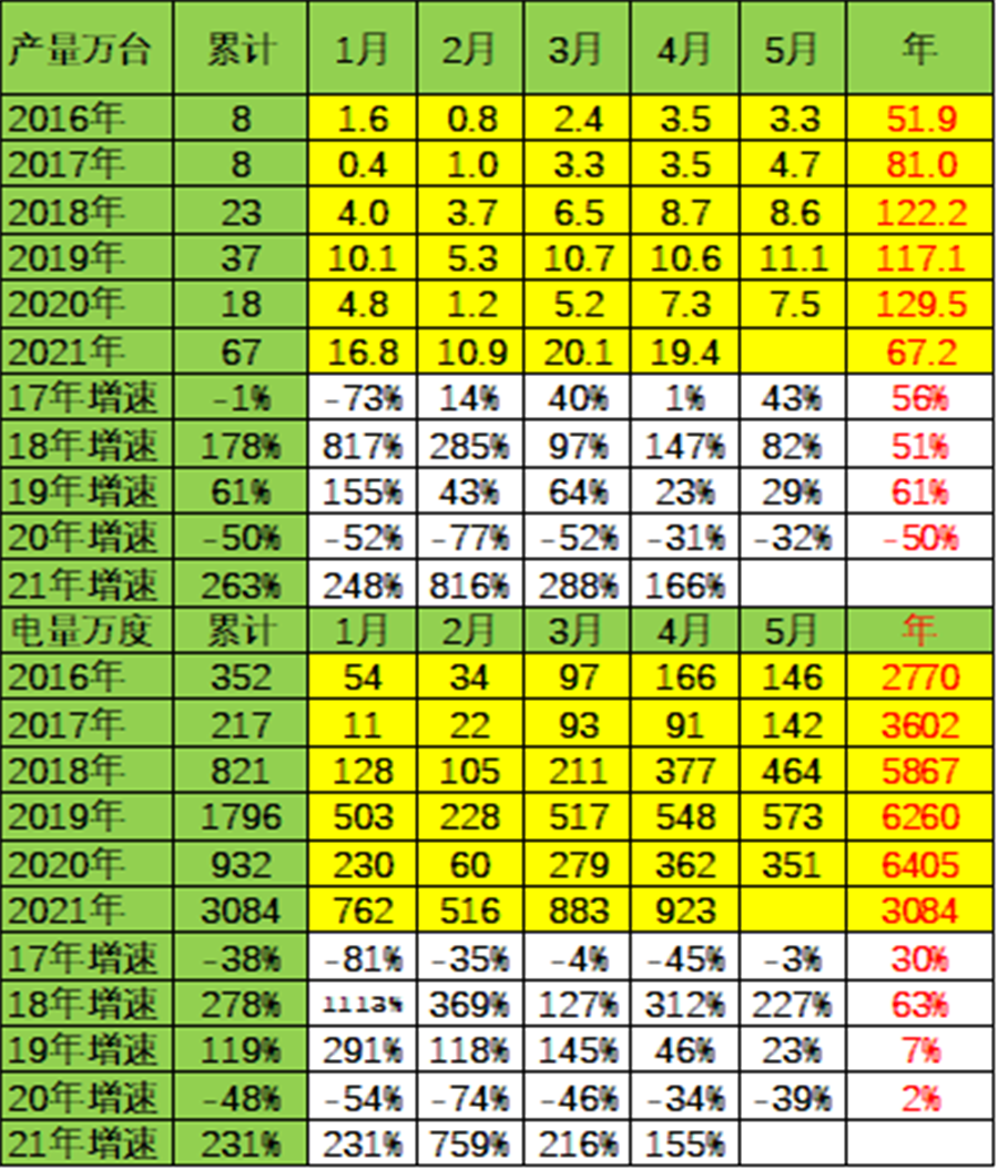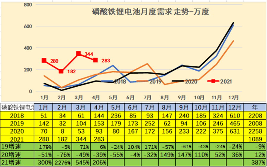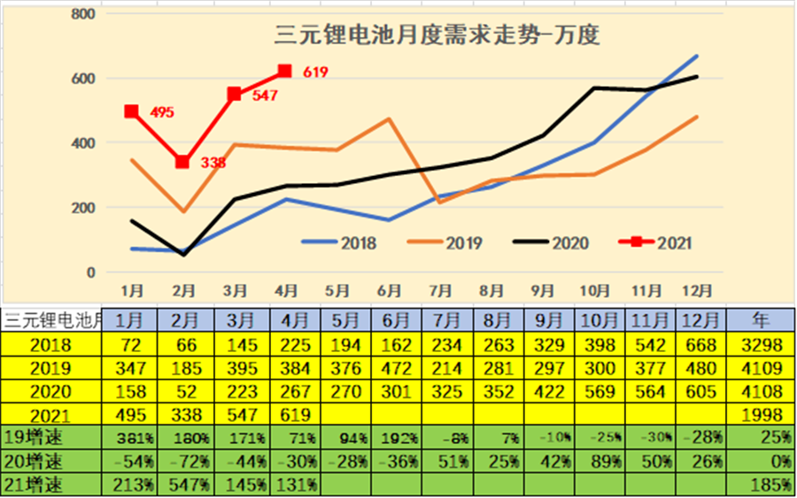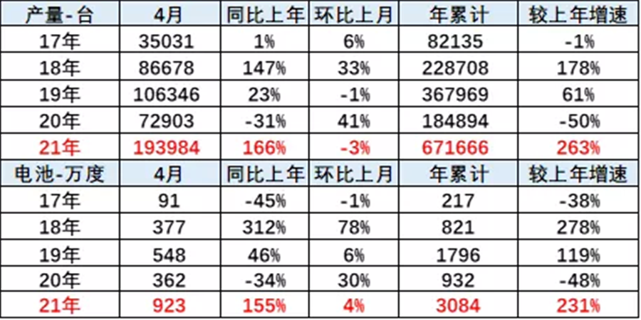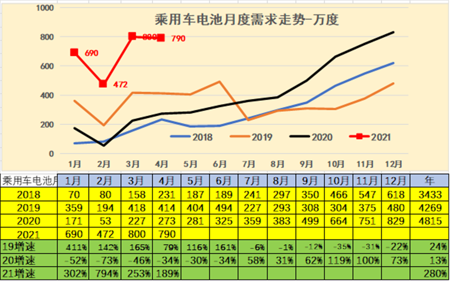 2021年在1-4月份的電池需求較高,同比增長仍是巨大的。2021年全年增長380%。