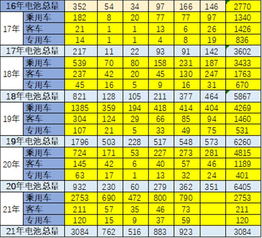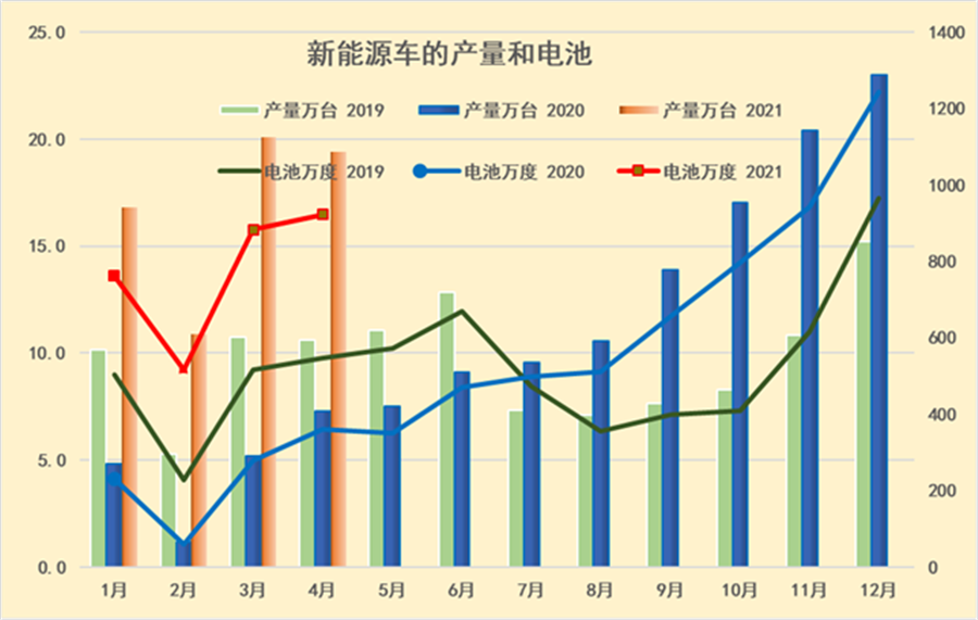 2021年1-4月的電池需求3084萬度,大幅好于2020年1-4月的電池2150萬度需求。由于去年貼退坡前后的干擾因素,因此2021年4月的電池需求相對較強。