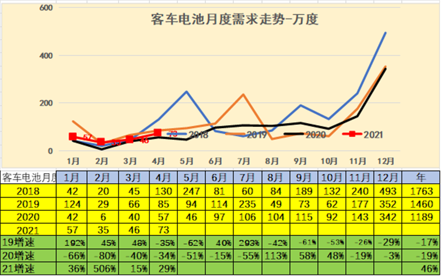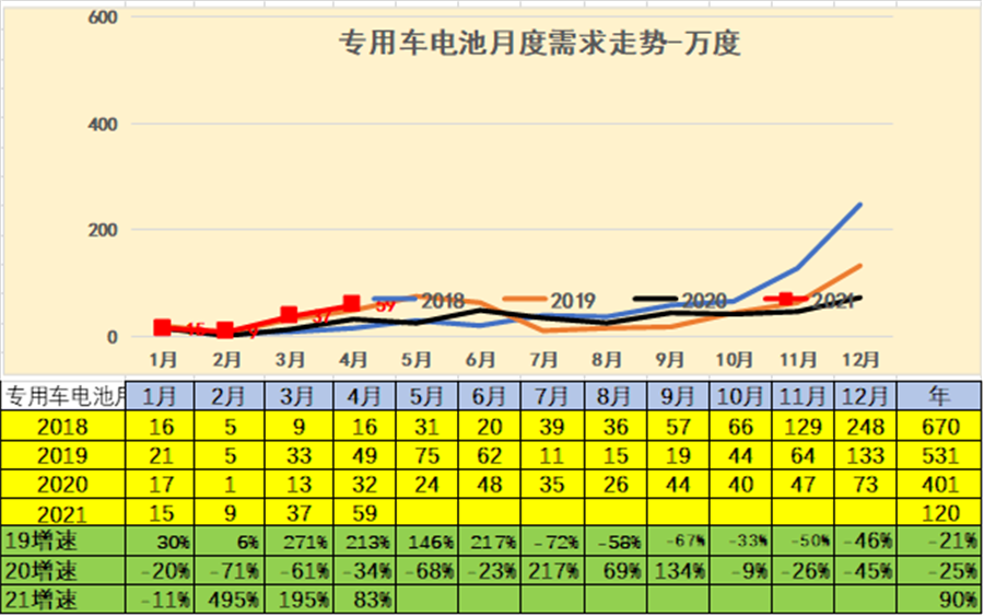 21年初專用車用電需求增長較猛。4月的專用車電池需求59萬度,較去年同期的32萬度大幅增長。