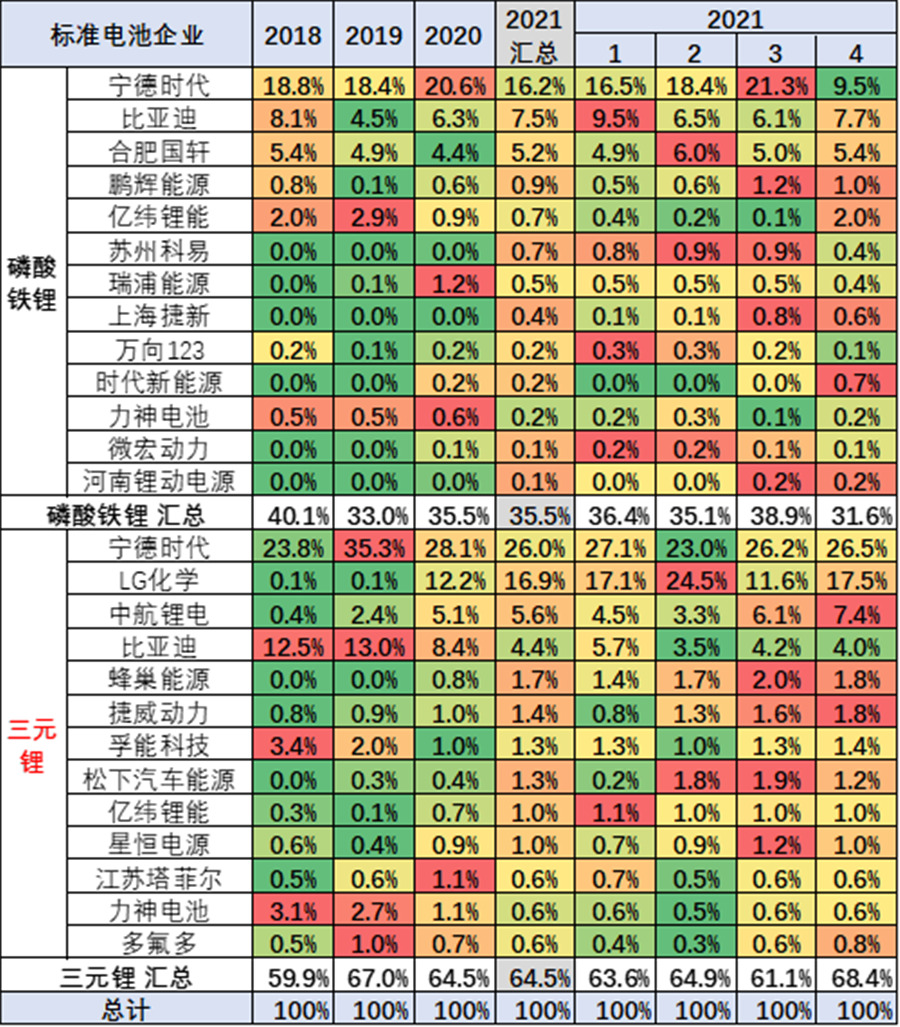 磷酸鐵鋰的電池仍是寧德時代最強,20年達到58%。磷酸鐵鋰的主力廠家優(yōu)勢相對明顯,近期國軒等表現(xiàn)優(yōu)秀,主要技術(shù)相對成熟,產(chǎn)品競爭相對穩(wěn)定。