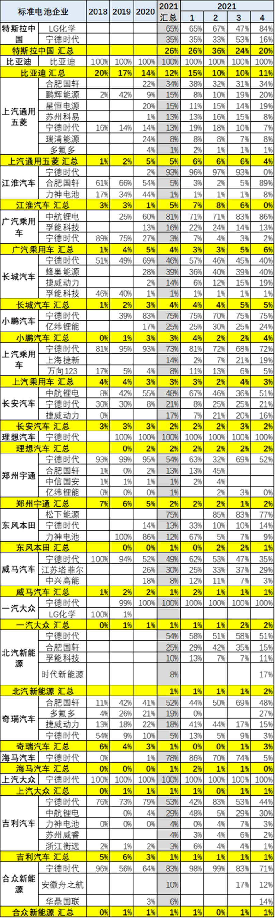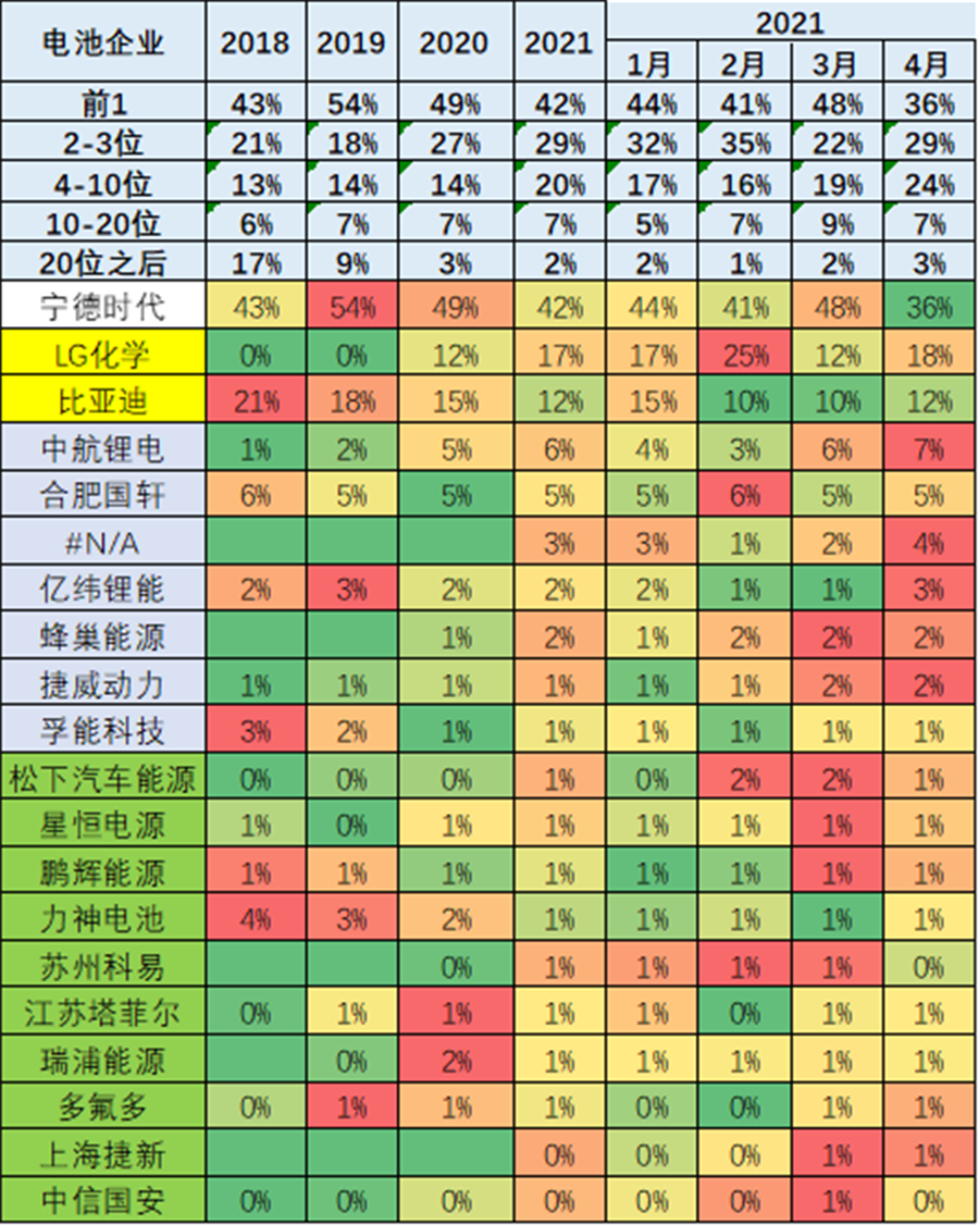從電池配套特征看,市場競爭格局劇烈變化,寧德時代、比亞迪(01211)的總體優(yōu)勢地位明顯。二線企業(yè)的表現(xiàn)巨變,中航鋰電、合肥國軒、蜂巢能源等隨著配套企業(yè)的變化而份額波動。