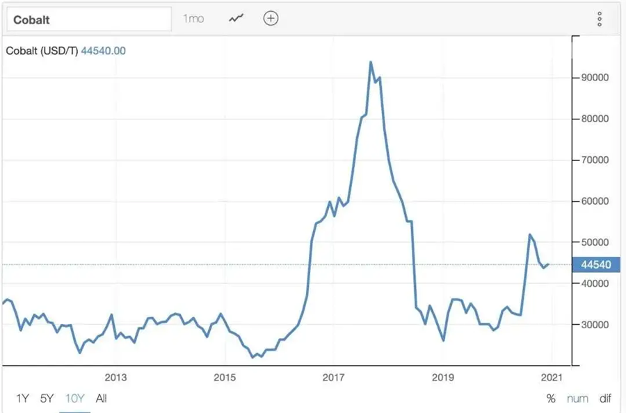 其中,鈷金屬大部分分布在剛果(金),因為長年戰(zhàn)亂,供給極不穩(wěn)定,價格波動劇烈,很多電池廠商一直在想辦法降低鈷含量,包括特斯拉和長城旗下的豐巢能源都喊出“無鈷電池”,鈷的價格也從2018年上半年的9萬美元/噸下降至現(xiàn)在的4.45萬美元左右,近乎腰斬。