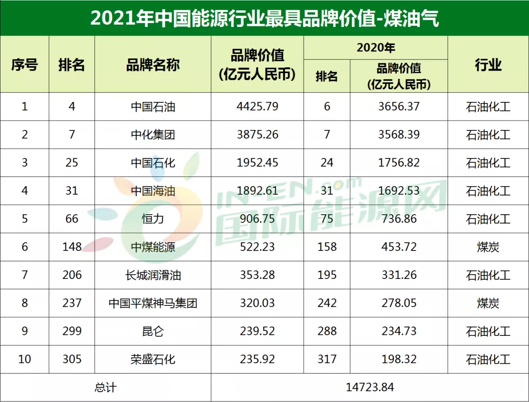 國(guó)際能源網(wǎng)記者發(fā)現(xiàn),本次共有10家煤油氣類(lèi)的企業(yè)品牌上榜,總價(jià)值達(dá)14723.84億元,其中,有“三桶油”之稱(chēng)的中石油、中石化、中海油分別以4425.79億元、1952.45億元和1892.61億元的品牌價(jià)值位列4名、25名和31名。