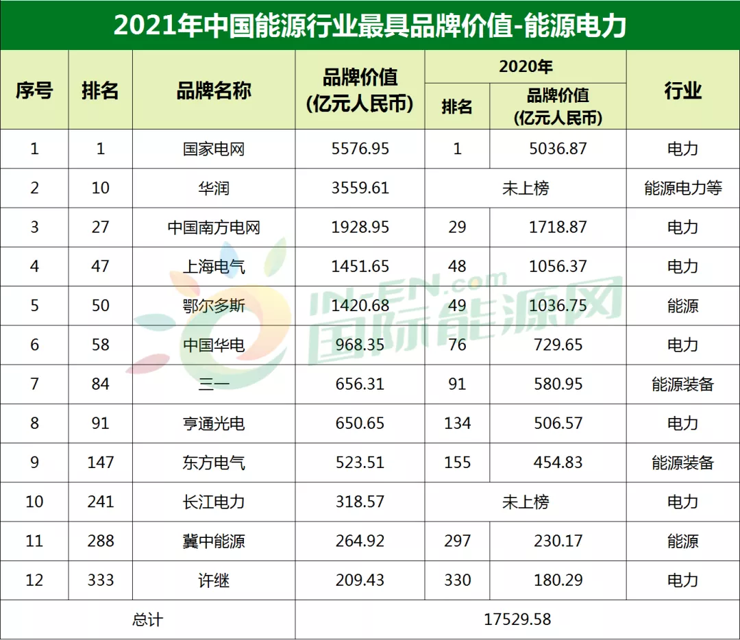 據(jù)國(guó)際能源網(wǎng)記者統(tǒng)計(jì),此次上榜的12家能源電力類(lèi)企業(yè)品牌中,華潤(rùn)和長(zhǎng)江電力今年新上榜,9家能源電力企業(yè)品牌排名較去年上升,只有國(guó)家電網(wǎng)名次始終保持穩(wěn)定。其中,亨通光電排名上升幅度最大,從去年排名第134位上升到今年的第91位,品牌價(jià)值也在一年之內(nèi)增加了144.08億元。