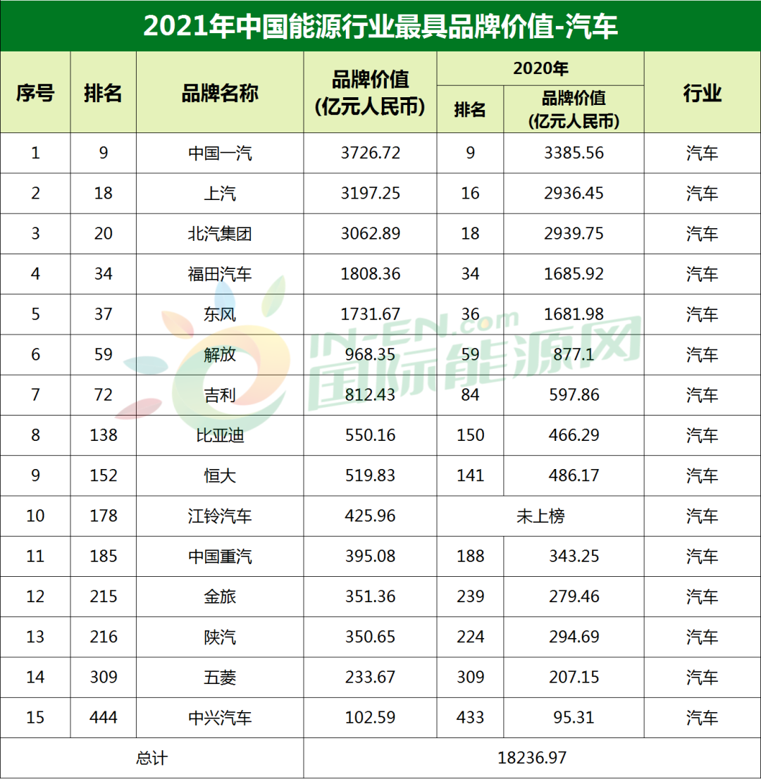 此次上榜的15家汽車(chē)類(lèi)企業(yè)品牌中,除江鈴汽車(chē)一家企業(yè)品牌今年新上榜外,5家企業(yè)品牌排名較去年上升,5家企業(yè)品牌排名較去年上升,中國(guó)一汽、福田汽車(chē)、解放、五菱名次始終保持穩(wěn)定。其中,比亞迪排名上升12名,品牌價(jià)值也在一年之內(nèi)增加了近百億,這可能是比亞迪的新能源汽車(chē)為品牌排名奠定了基礎(chǔ)。
