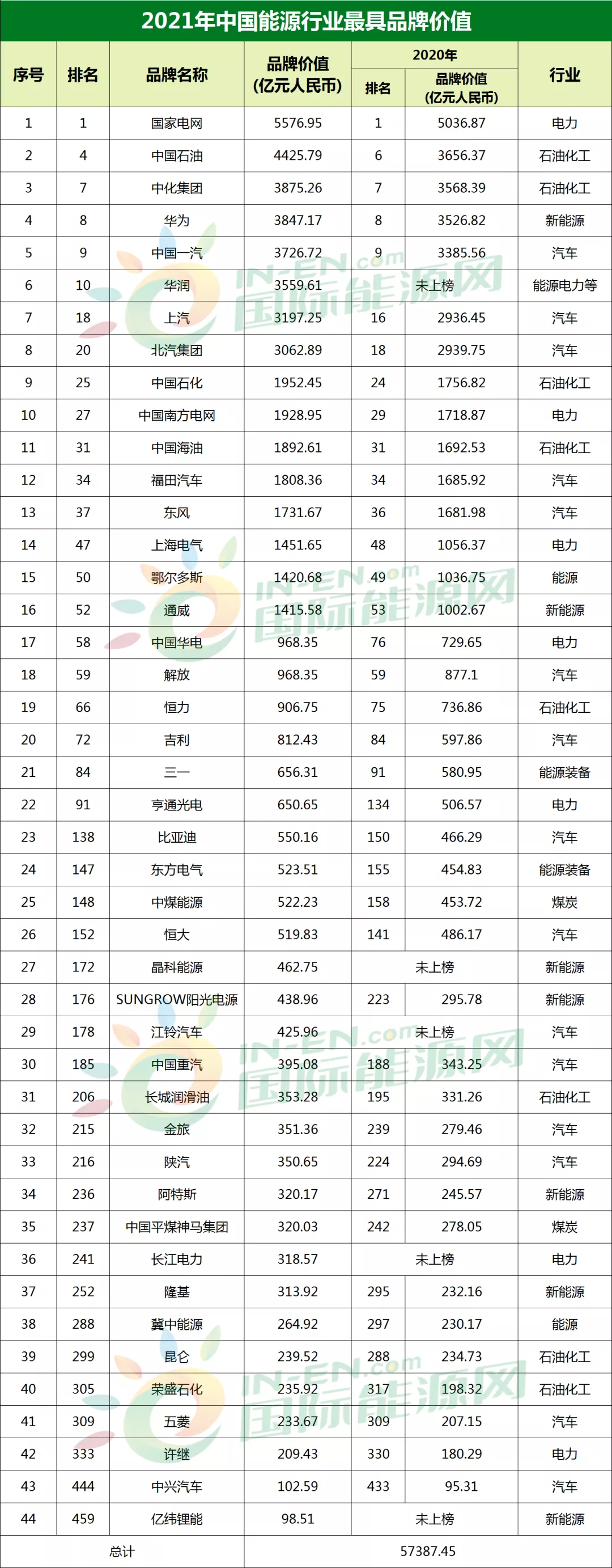 6月22日,全球領(lǐng)先的獨(dú)立品牌評(píng)級(jí)機(jī)構(gòu)世界品牌實(shí)驗(yàn)室(World Brand Lab)在北京發(fā)布了2021年《中國(guó)500最具價(jià)值品牌》排行榜單。據(jù)國(guó)際能源網(wǎng)記者統(tǒng)計(jì),有包括國(guó)家電網(wǎng)、中國(guó)石油、中化集團(tuán)等44家能源類(lèi)企業(yè)上榜,累計(jì)品牌價(jià)值高達(dá)57387.45億元人民幣。
