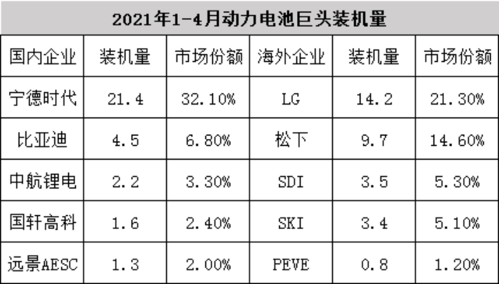 2021年,全球動力電池TOP10企業(yè)的裝機量占比開始發(fā)生變化。根據(jù)SNE數(shù)據(jù)顯示,1-4月全球動力電池TOP10裝機量中,中國企業(yè)裝機量占比提升至46.6%,海外企業(yè)裝機量占比下降至47.5%。