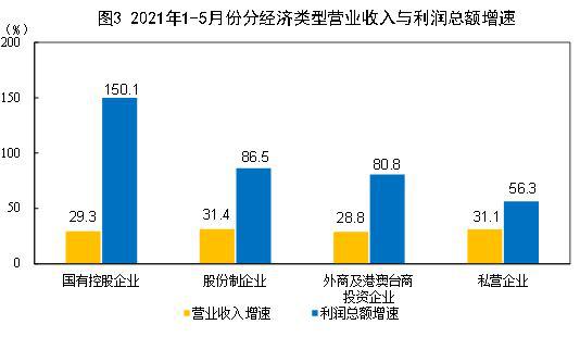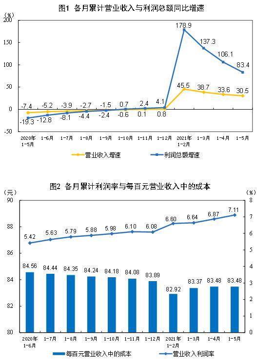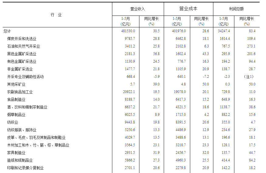 1—5月份,全國規(guī)模以上工業(yè)企業(yè)實(shí)現(xiàn)利潤總額34247.4億元,同比增長83.4%(按可比口徑計算,詳見附注二),比2019年1—5月份增長48.0%,兩年平均增長21.7%。