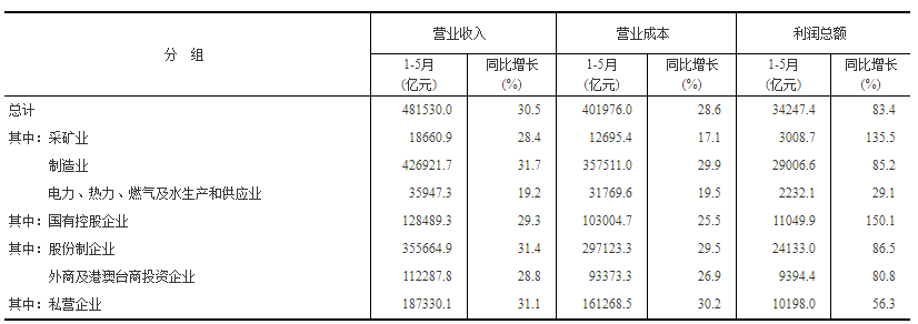 1—5月份,采礦業(yè)實(shí)現(xiàn)利潤總額3008.7億元,同比增長1.36倍;制造業(yè)實(shí)現(xiàn)利潤總額29006.6億元,增長85.2%;電力、熱力、燃?xì)饧八a(chǎn)和供應(yīng)業(yè)實(shí)現(xiàn)利潤總額2232.1億元,增長29.1%。