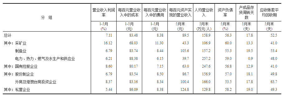 5月末,規(guī)模以上工業(yè)企業(yè)每百元資產(chǎn)實(shí)現(xiàn)的營業(yè)收入為89.5元,同比增加14.5元;人均營業(yè)收入為158.9萬元,同比增加36.3萬元;產(chǎn)成品存貨周轉(zhuǎn)天數(shù)為17.8天,同比減少3.1天;應(yīng)收賬款平均回收期為52.5天,同比減少7.0天。