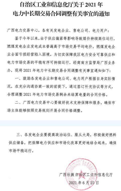 日前廣西工信廳發(fā)布《關于2021年電力中長期交易合同調整有關事宜的通知》(文件具體內(nèi)容見文末),其中提到:今年以來,由于供應偏緊等影響導致煤價持續(xù)高位運行,燃煤發(fā)電企業(yè)發(fā)電成本普遍高于市場交易平均電價,燃煤發(fā)電企業(yè)全面虧損經(jīng)營陷入困境。為了保障電力市場交易的平穩(wěn)有序可持續(xù)運營,因此鼓勵各發(fā)電企業(yè)和售電公司、電力用戶根據(jù)自身情況,在充分溝通協(xié)商一致的前提下,通過簽訂補充協(xié)議等方式,合理調整2021年電力市場交易剩余未結算電量的合同電價。