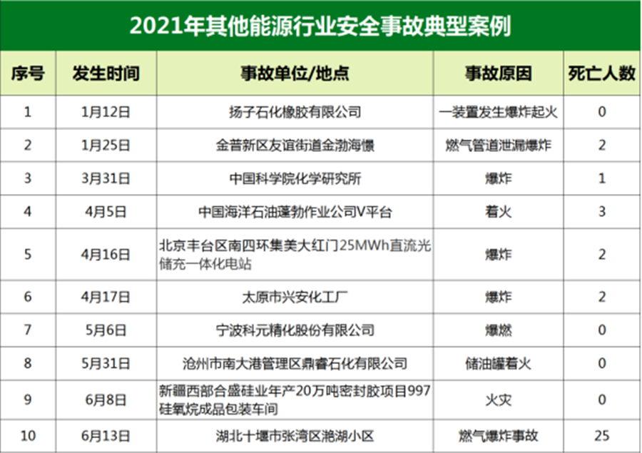 除電力、煤礦事故外,其他能源行業(yè)安全事故也時有發(fā)生。國際能源網(wǎng)記者總結了2021年典型能源安全事故發(fā)現(xiàn),其他能源行業(yè)安全事故多為火災事故。天然氣、化工廠、儲能電站依然是火災事故隱患較為集中的領域。因此,做好消防措施也是減少人員傷亡的有效手段之一。