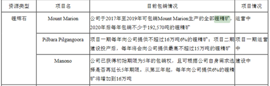 當(dāng)然,除了鋰鹽湖,鋰礦也是角逐的對(duì)象。天齊官方數(shù)據(jù)顯示,目前擁有鋰精礦年產(chǎn)能134萬(wàn)噸,規(guī)劃年產(chǎn)能194萬(wàn)噸;贛鋒鋰業(yè)目前包銷MountMarion項(xiàng)目19.25萬(wàn)噸/年鋰精礦;包銷Pilgangoora項(xiàng)目1期、2期共計(jì)31萬(wàn)噸/年鋰精礦;包銷Manono項(xiàng)目16萬(wàn)噸/年鋰精礦,具體如下表所示: