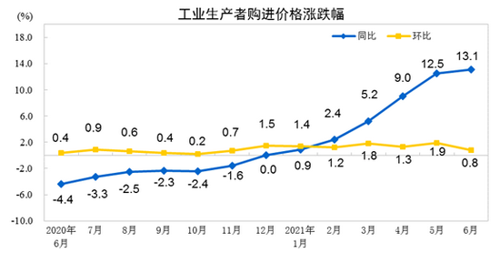 2021年6月份,全國工業(yè)生產(chǎn)者出廠價格同比上漲8.8%,環(huán)比上漲0.3%;工業(yè)生產(chǎn)者購進價格同比上漲13.1%,環(huán)比上漲0.8%。上半年,工業(yè)生產(chǎn)者出廠價格比去年同期上漲5.1%,工業(yè)生產(chǎn)者購進價格上漲7.1%。