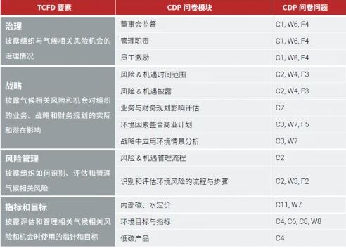 自2018年以來(lái),CDP問(wèn)卷模塊已與TCFD信息披露框架進(jìn)行對(duì)標(biāo)。這意味著,通過(guò)CDP 披露的環(huán)境信息與TCFD 建議的信息披露框架完全一致。