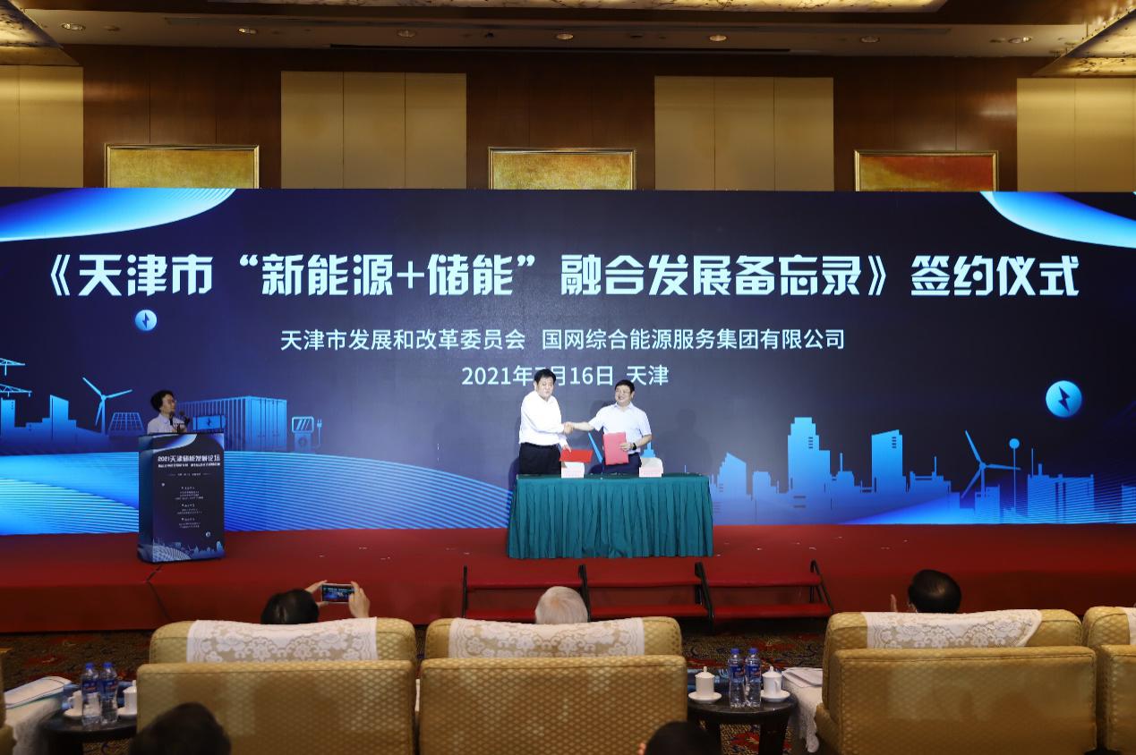 在簽約儀式環(huán)節(jié),天津市發(fā)展和改革委員會(huì)副主任楊志耘與國(guó)網(wǎng)綜合能源服務(wù)集團(tuán)有限公司黨委委員、副總經(jīng)理樊功成上臺(tái)簽署《天津市“新能源+儲(chǔ)能”融合發(fā)展備忘錄》。