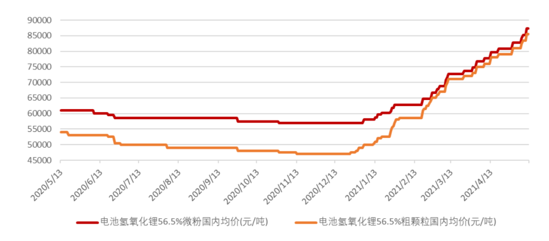 “電池級氫氧化鋰現(xiàn)貨均價為每噸89500元,較去年年底上漲了80%;碳酸鋰材料價格已從去年年中的每噸3.8萬元漲到了目前的9萬元”,國軒高科相關(guān)負責(zé)人對中國汽車報表示。