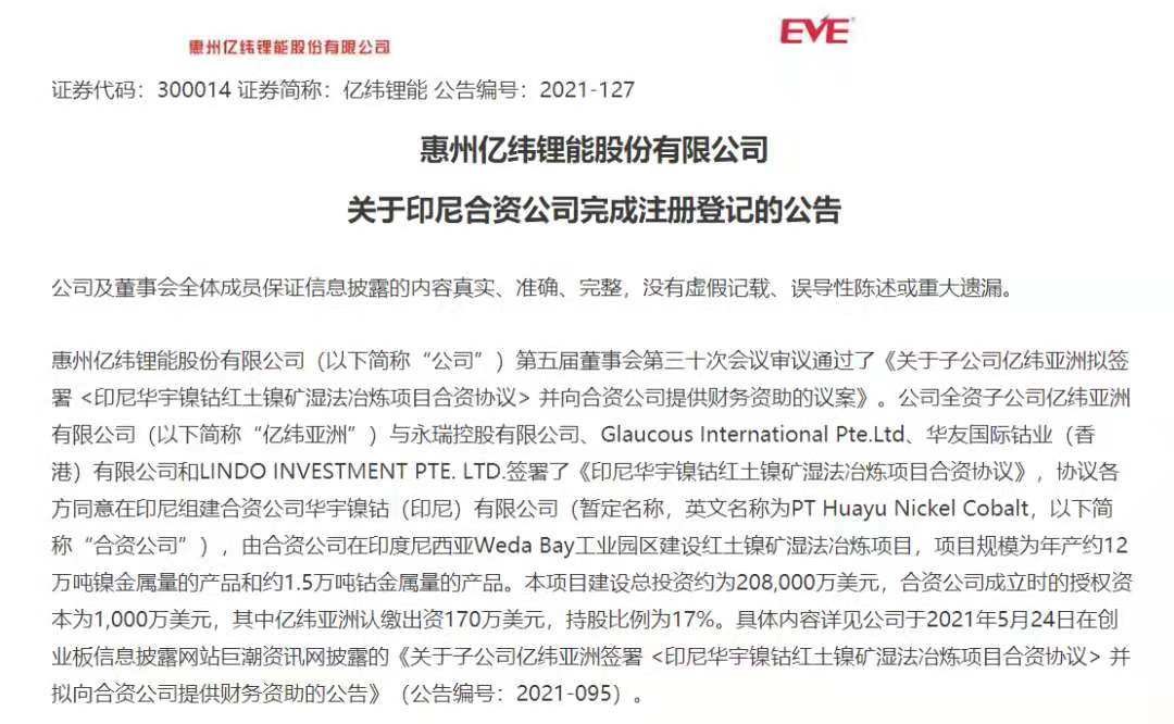 億緯鋰能印尼公司完成注冊公告,截圖自Wind