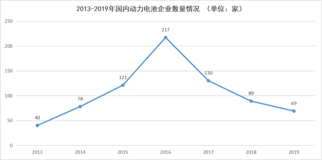 受此影響,國內(nèi)動力電池行業(yè)中企業(yè)的數(shù)量也從2016年的217家,迅速跌落至2019年的69家。