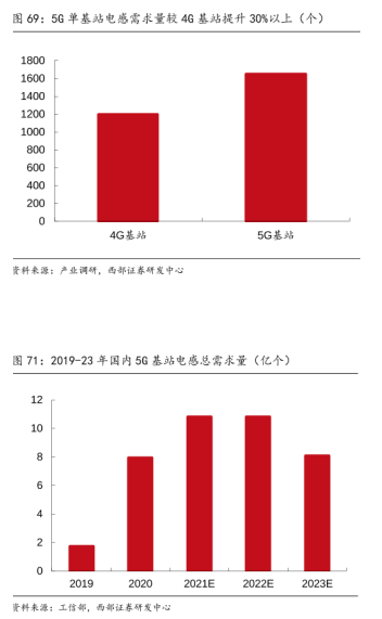 對于磁性元器件行業(yè)來說,5G基站和智慧燈桿的大力推廣與發(fā)展帶來了很大的市場發(fā)展空間,如:射頻電感、功率電感等。根據(jù)產(chǎn)業(yè)調(diào)研、西部證券研發(fā)中心的數(shù)據(jù)顯示,5G基站的電感需求用量將會提升30%以上,電感用量從原來4G基站的1100-1300顆,到如今5G基站的1600-1700顆。而且總需求量也在不斷上升。