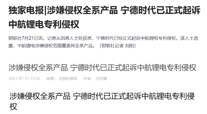7月21日,多方媒體報(bào)道寧德時(shí)代已經(jīng)正式起訴中航鋰電專利侵權(quán),中航鋰電涉嫌侵權(quán)范圍覆蓋其全系產(chǎn)品。法律界人士表示,中航鋰電一旦敗訴,全系產(chǎn)品可能面臨禁售。