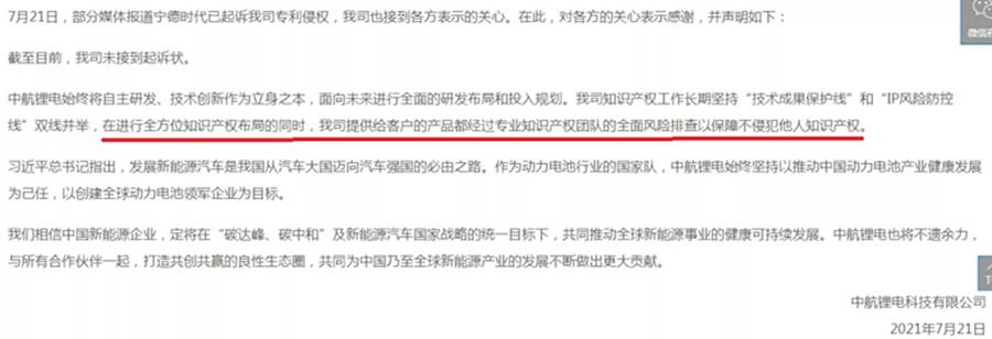 中航鋰電隨后很快就官方發(fā)布了聲明:表示知識產(chǎn)權(quán)工作始終堅持“技術(shù)成果保護(hù)”和“IP風(fēng)險防控”雙線并舉,并重點提到“在進(jìn)行全方位知識產(chǎn)權(quán)布局的同時,我司提供給客戶的產(chǎn)品都經(jīng)過專業(yè)的知識產(chǎn)權(quán)團(tuán)隊的全面風(fēng)險排查以保障不得侵犯他人知識產(chǎn)權(quán)”。