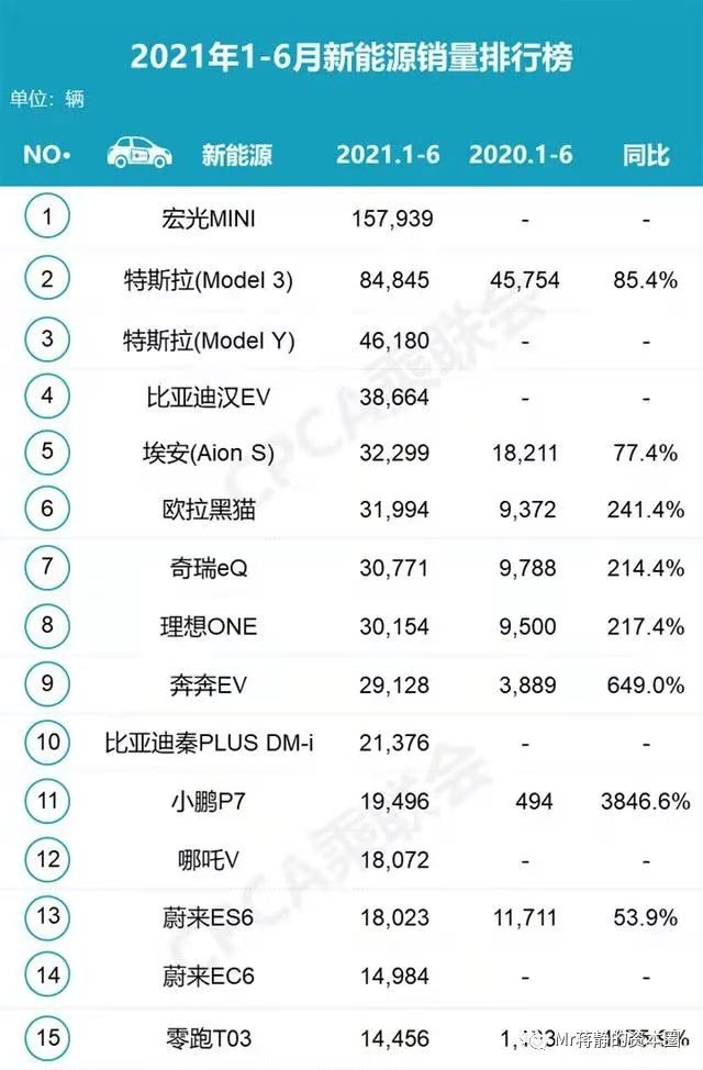 根據(jù)乘聯(lián)會的數(shù)據(jù),2021年1-6月我國電動乘用車銷量排名:五菱宏光MINI EV以157939輛的成績排名第一,特斯拉Model3與ModelY合計(jì)銷量131025輛,比亞迪漢EV銷量38664輛,廣汽埃安AionS銷量32299輛。