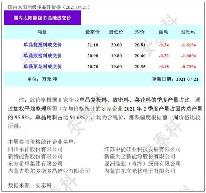 從上游價格跟蹤來看,根據(jù)硅業(yè)分會報價分析,本周多晶硅價格延續(xù)緩跌下行走勢,其中單晶復(fù)投料、單晶致密料、單晶菜花料成交均價跌幅都在1%左右。