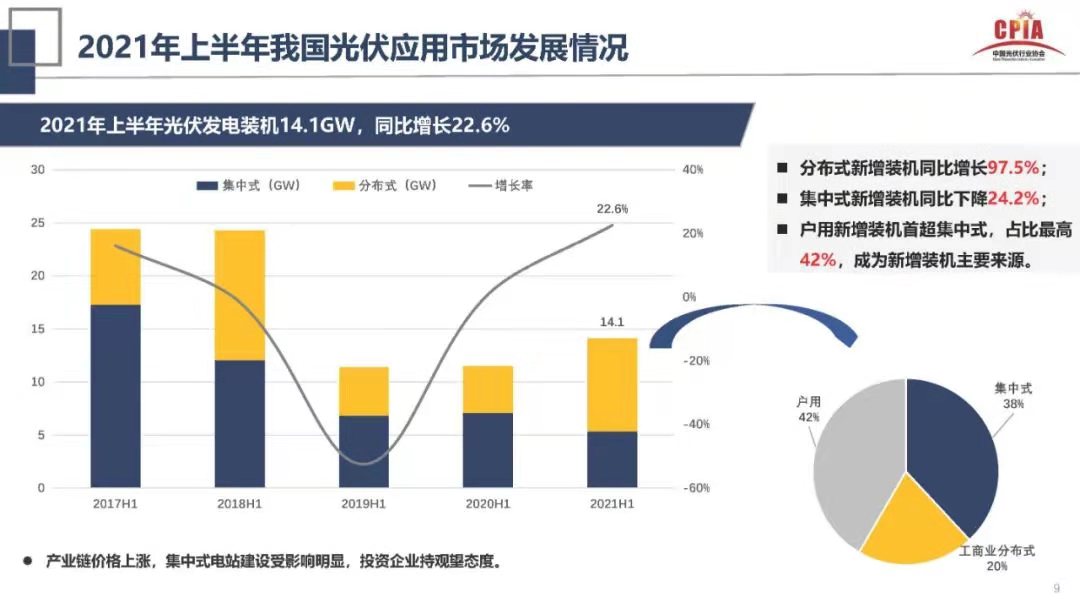 不過,相比于地面電站,今年分布式光伏市場有望迎來新突破。根據(jù)中國光伏行業(yè)協(xié)會數(shù)據(jù),上半年光伏新增裝機14.1GW,其中分布式占比達到62%,戶用新增裝機占比42%,超過集中式電站,成為上半年新增裝機主要來源。