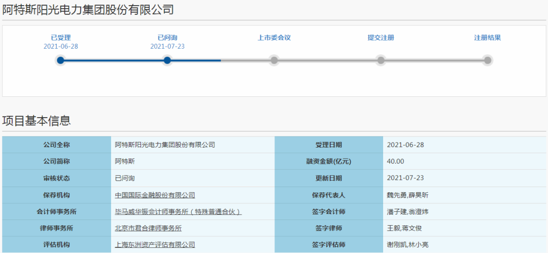 上市進(jìn)度方面,阿特斯上市申請?jiān)?月28日被上交所受理,7月23日進(jìn)入“已問詢”狀態(tài),如能順利進(jìn)行的話,很有可能會(huì)在年內(nèi)登陸A股市場。