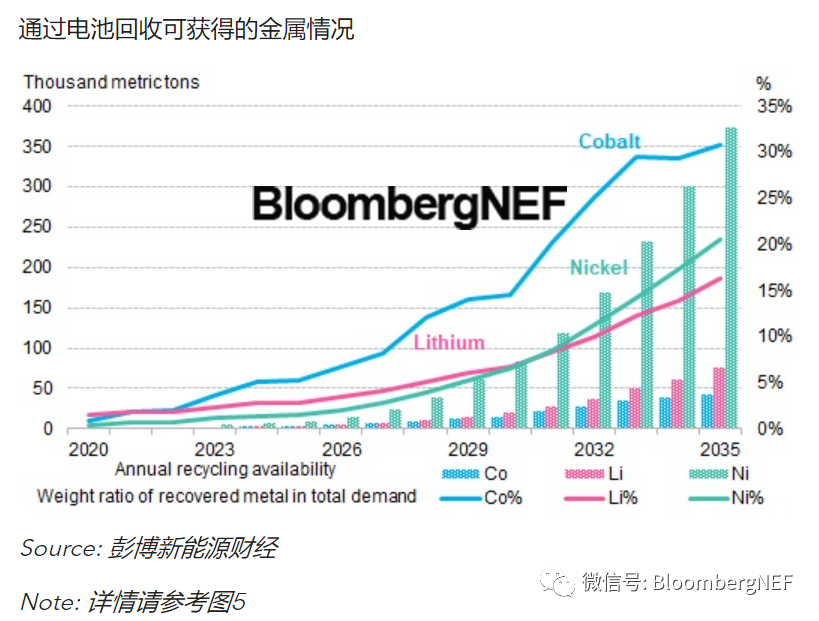 2035年可供回收的退役電池規(guī)模將達(dá)到500萬噸,回收所得鈷、鋰和鎳分別能夠滿足新電池生產(chǎn)所需對(duì)應(yīng)金屬的30%、16%和21%。回收電池在抵消現(xiàn)貨價(jià)格波動(dòng)和舒緩資源限制方面發(fā)揮日益重要的作用。