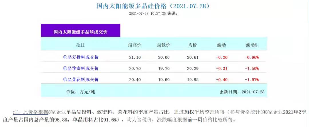 7月28日,中國有色金屬工業(yè)協(xié)會硅業(yè)分會發(fā)布消息,多晶硅價(jià)格延續(xù)緩跌走勢,最大跌幅近2%。