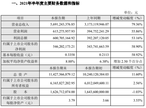 2021年上半年橫店東磁實現(xiàn)營業(yè)收入約56.91億元,同比增長79.36%,歸屬于上市公司股東的凈利潤約5.46億元,同比增長58.90%。