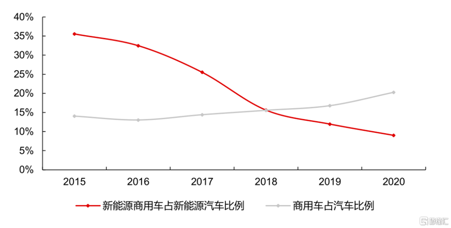 毋庸置疑,國內(nèi)汽車的電動(dòng)化成效顯著,銷量屢創(chuàng)新高,但是電動(dòng)車的增長主要來自乘用車,商用車幾乎沒有增長,尤其是中長途的重卡領(lǐng)域,電動(dòng)化進(jìn)展緩慢,甚至受阻。過去幾年,新能源商用車在新能源內(nèi)部滲透率不升反降,到了2020年新能源商用車的占比僅有9%。