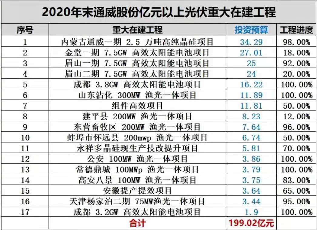 事實(shí)上,通威股份很多重大在建工程也都進(jìn)入收官階段。據(jù)黑鷹光伏統(tǒng)計(jì),截止2020年末,通威股份有17個(gè)億元以上的光伏重大在建工程,總投資預(yù)算達(dá)199.02億元,其中14個(gè)項(xiàng)目的工程進(jìn)度在50%以上,10個(gè)項(xiàng)目工程進(jìn)度超過80%。