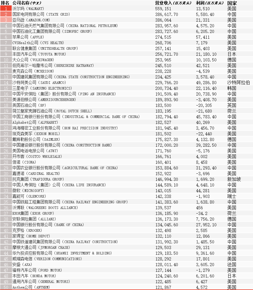 8月2日,《財富》世界500強排行榜發(fā)布。受新冠疫情影響,今年《財富》世界500強排行榜企業(yè)的營業(yè)收入約為31.7萬億美元,比去年下降5%。今年,沃爾瑪連續(xù)第八年成為全球最大公司,中國的國家電網公司上升至第二位,亞馬遜首次進入前三,蘋果公司前進至第6位。