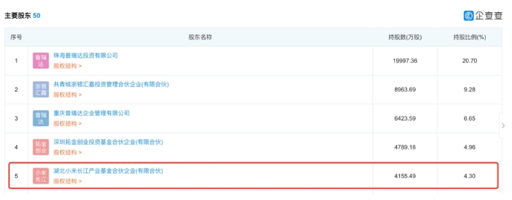 企查查數(shù)據(jù)顯示,2018年12月,小米產(chǎn)投就曾對珠海冠宇進行了投資,持有珠海冠宇4.3%的股份,是其第五大股東。