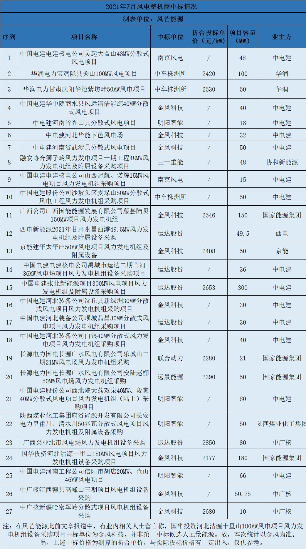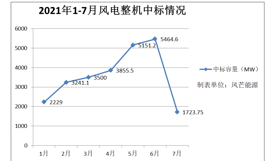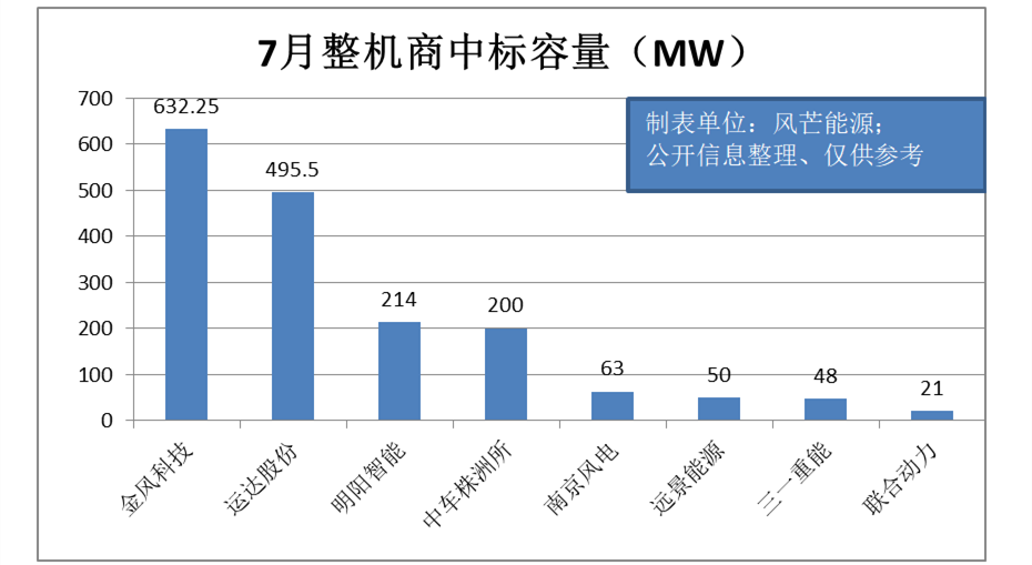 據(jù)風(fēng)芒能源不完全統(tǒng)計,根據(jù)公開信息整理,7月份風(fēng)電市場一共中標(biāo)27個風(fēng)機采購項目、共計1723.75MW。(其中,金風(fēng)科技中標(biāo)632.25MW,位列第一。接下依次為:運達股份(495.5MW)、明陽智能(214MW)、中車株洲所(200MW)、南京風(fēng)電(63MW)、遠景能源(50MW)、三一重能(48MW)、聯(lián)合動力(21MW)。)