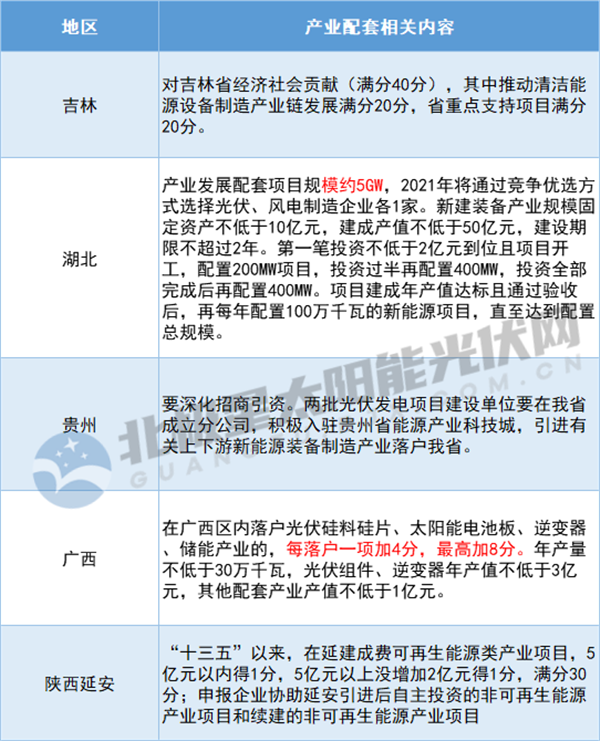 如吉林省風(fēng)光項(xiàng)目分配實(shí)施細(xì)則(暫行)中競(jìng)爭(zhēng)性配置細(xì)則要求,對(duì)吉林省經(jīng)濟(jì)社會(huì)發(fā)展貢獻(xiàn)滿分40分,占比高達(dá)40%。廣西則將產(chǎn)業(yè)配套設(shè)定為加分項(xiàng),規(guī)定在廣西落戶硅料、硅片、電池、光伏逆變器及儲(chǔ)能產(chǎn)業(yè)的,每落戶一項(xiàng)得4分,最高可得8分。同時(shí)要求,年產(chǎn)量不低于30萬(wàn)千瓦,組件、逆變器產(chǎn)值不低于3億元,其余產(chǎn)業(yè)產(chǎn)值不低于1億元。并要求未開工建設(shè)的一年半內(nèi)建成投產(chǎn)。