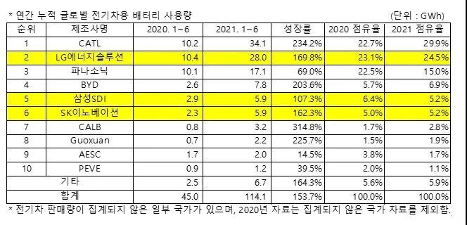 近日,韓國能源市場分析機構(gòu)SNE Research公布的統(tǒng)計數(shù)據(jù)顯示,今年上半年,全球車載動力電池裝機量共計114.1 GWh,較去年同期的45 GWh增長了1.5倍。其中,排名前三的公司依次是寧德時代(CATL)、LG能源和松下,三家巨頭占據(jù)了全球動力電池市場近70%的份額。