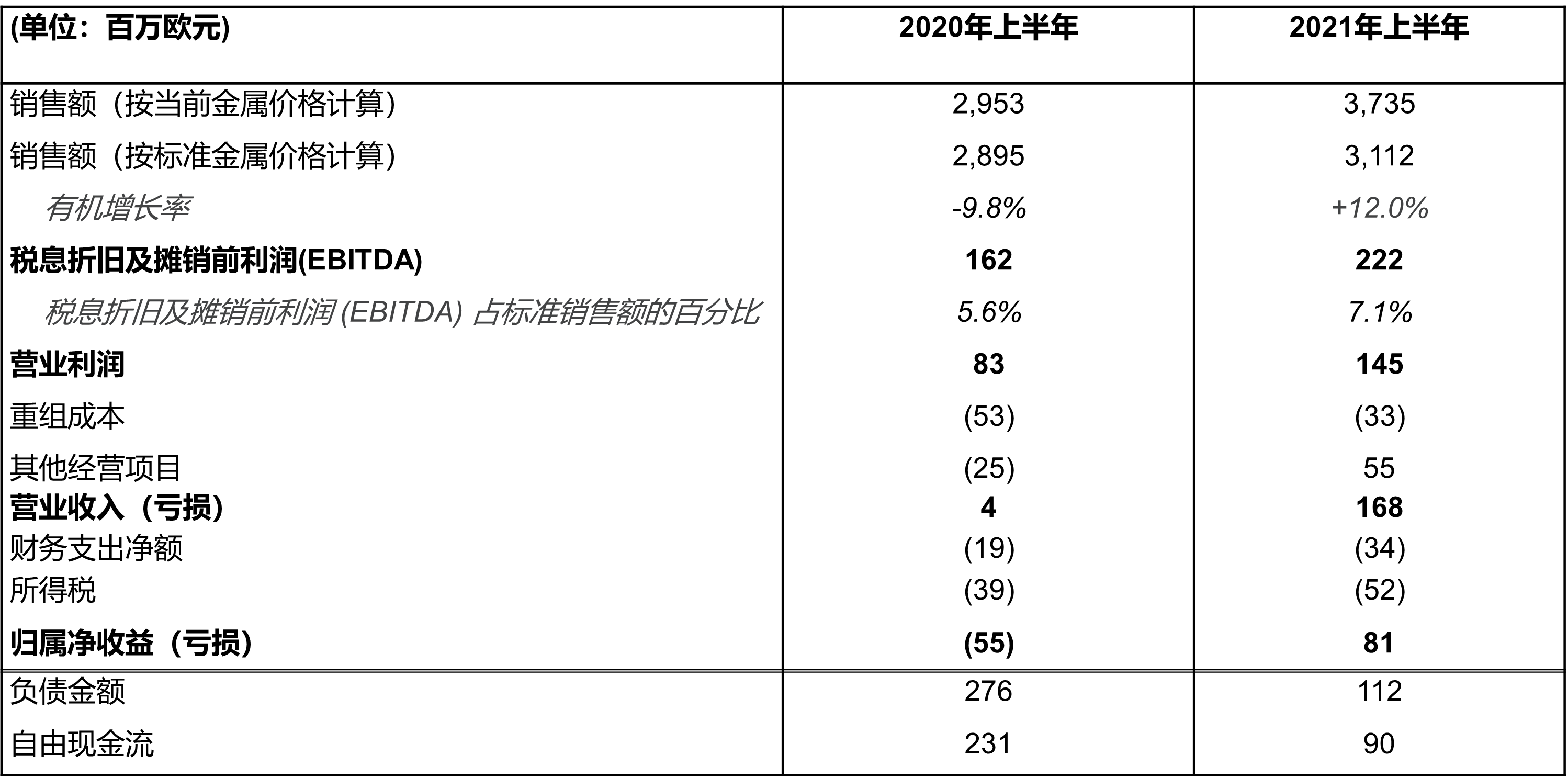 2021年上半年,按標(biāo)準(zhǔn)金屬價格計(jì)算的銷售額達(dá)31.12億歐元,與上年同期相比實(shí)現(xiàn)內(nèi)生增長12%,其中第二季度同比增長24.2%,反映了需求回升及有效的產(chǎn)品組合和價格管理。