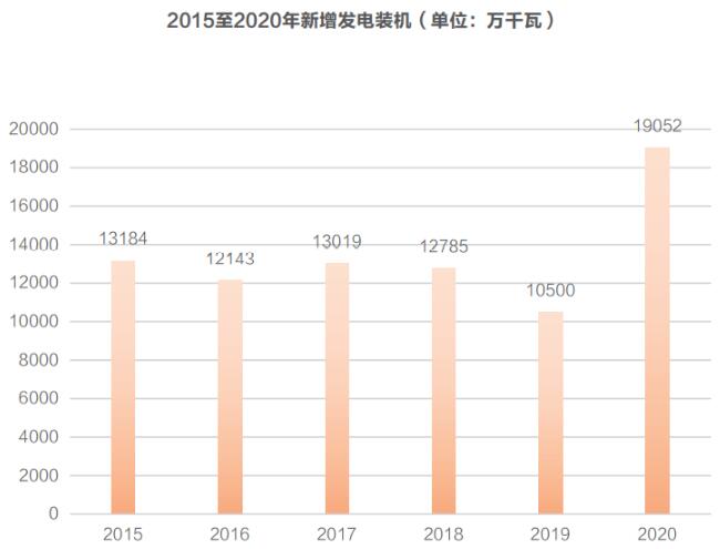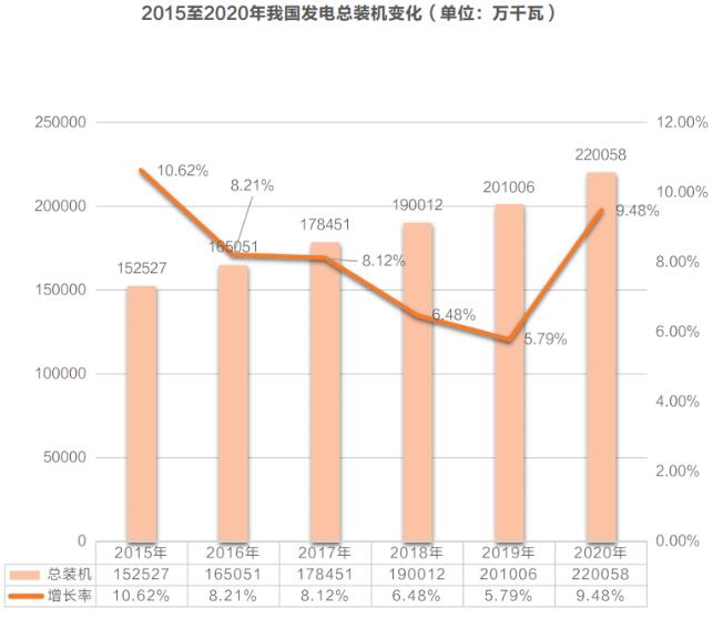 那么相對(duì)于需求端,電力供給端的情況怎么樣呢?國(guó)內(nèi)發(fā)電總裝機(jī)增速在2015至2019年呈現(xiàn)出不斷下滑趨勢(shì),只有2020年有較快增長(zhǎng)。根據(jù)《能源》雜志測(cè)算,2015年至2020年發(fā)電總裝機(jī)容量的年均增長(zhǎng)率為7.61%。