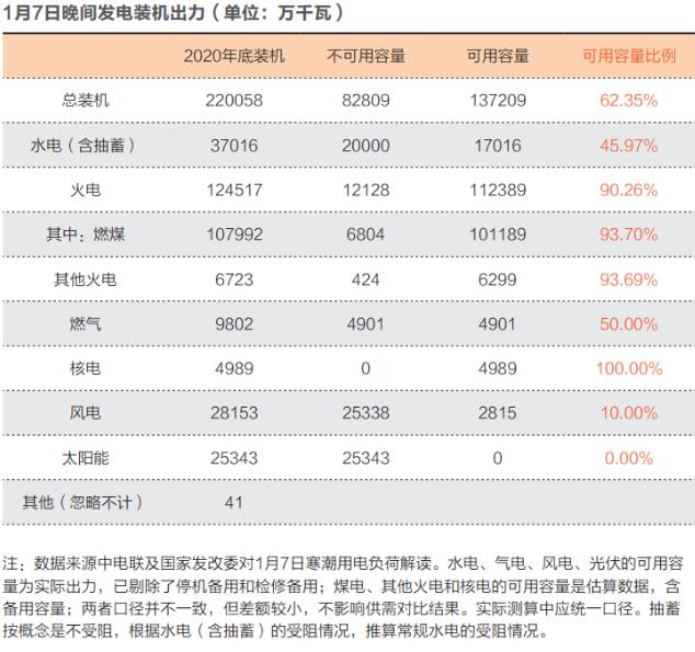 所謂可用發(fā)電裝機(jī)容量,指的是發(fā)電機(jī)組在實(shí)際運(yùn)行中所能提供的可靠發(fā)電出力。例如在2021年1月7日的寒潮用電負(fù)荷高峰中,全國(guó)用電負(fù)荷高峰為11.89億千瓦,但我國(guó)22億千瓦的總裝機(jī)依然無(wú)法滿足電力需求。這就是可用發(fā)電裝機(jī)容量不足導(dǎo)致的。