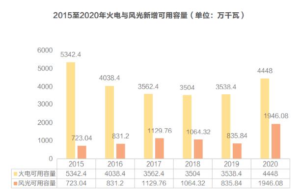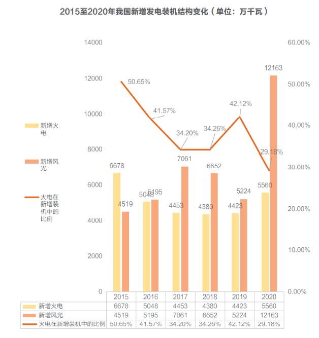 “十三五”期間,我國(guó)的風(fēng)電、光伏裝機(jī)容量進(jìn)入飛速發(fā)展時(shí)期。與此同時(shí),2015年之后的火電建設(shè)速度大大放緩。此消彼長(zhǎng)之下,整個(gè)“十三五”期間每年的新增風(fēng)光裝機(jī)都大于火電裝機(jī),而且火電在新增裝機(jī)中的比例也從2015年的50.65%下降至2020年的29.18%。