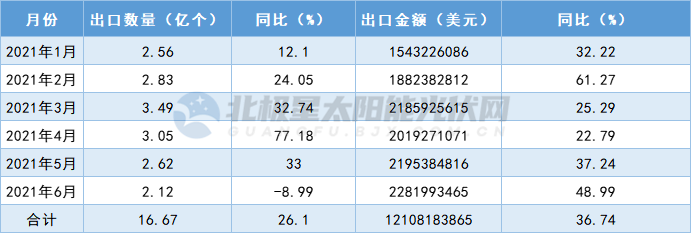 1-6月份,我國(guó)太陽能電池出口總量16.67億個(gè),較去年同期增加26.10%;1-6月份,太陽能電池片出口金額121.08億美元,較去年同期增加36.74%。