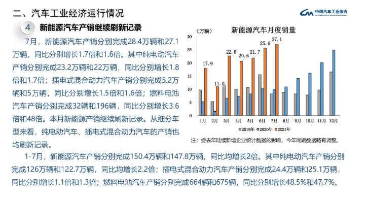 根據(jù)公布的數(shù)據(jù)顯示,7月,新能源汽車產(chǎn)銷分別完成28.4萬輛和27.1萬輛,同比分別增長(zhǎng)1.7倍和1.6倍,其中純電動(dòng)汽車產(chǎn)銷分別完成23.2萬輛和22萬輛,同比分別增長(zhǎng)1.8倍和1.7倍;插電式混合動(dòng)力汽車產(chǎn)銷分別完成5.2萬輛和5萬輛,同比分別增長(zhǎng)1.5和1.6倍;燃料電池汽車產(chǎn)銷分別完成32輛和196輛,同比分別增長(zhǎng)1.5倍和1.6倍。本月新能源產(chǎn)銷繼續(xù)刷新記錄,從細(xì)分車型來看,純電動(dòng)汽車、插電式混合動(dòng)力的產(chǎn)銷也均刷新記錄。