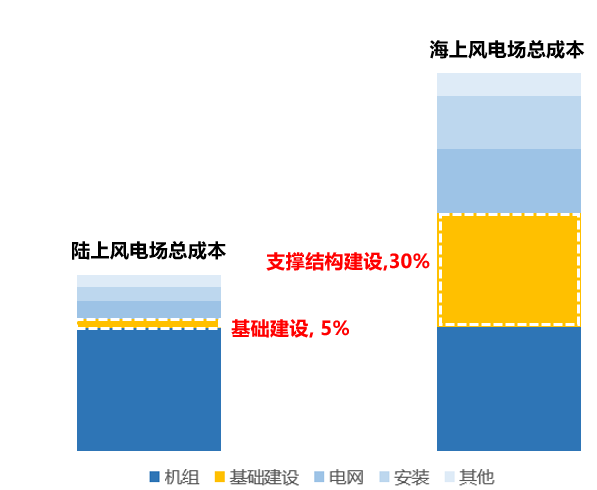相較陸上風(fēng)電,海上風(fēng)電的建設(shè)周期更長(zhǎng),施工條件更艱巨,施工難度更大;一般情況下,海上風(fēng)電的成本基本是陸上風(fēng)電成本的兩倍。同時(shí),海上風(fēng)電與陸上風(fēng)電的成本構(gòu)成也有很大不同,海上風(fēng)電的建設(shè)及運(yùn)維成本占比要遠(yuǎn)高于陸上,特別是海上支撐結(jié)構(gòu)采購(gòu)及安裝費(fèi)用,約占海上風(fēng)電項(xiàng)目總成本的30%左右。因此,降低支撐結(jié)構(gòu)的成本可以顯著地降低海上風(fēng)電平準(zhǔn)化度電成本(LCoE),幫助海上風(fēng)電平穩(wěn)地向平價(jià)階段過(guò)渡,大幅提高海上風(fēng)電的競(jìng)爭(zhēng)力。