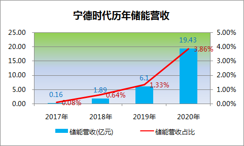 受政策環(huán)境影響、新能源汽車市場提振動力電池需求,自上市以來寧德時代便穩(wěn)穩(wěn)坐上國內(nèi)電池裝機(jī)排名C位、且市占率超過50%,總營收連年增長。在動力電池領(lǐng)域之外,寧德時代另一大核心業(yè)務(wù)——儲能系統(tǒng)營收也實現(xiàn)連年翻倍式增長、2020年實現(xiàn)儲能總營收19.43億元,儲能在總營收所占比重也快速提升達(dá)到3.86%。