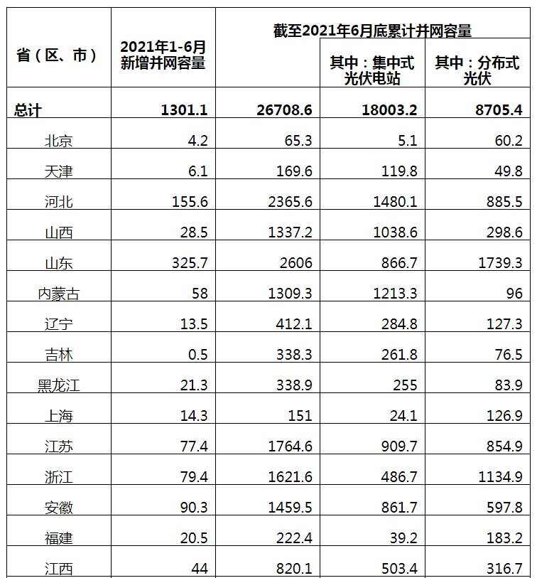 2021年上半年全國光伏發(fā)電建設(shè)運行情況