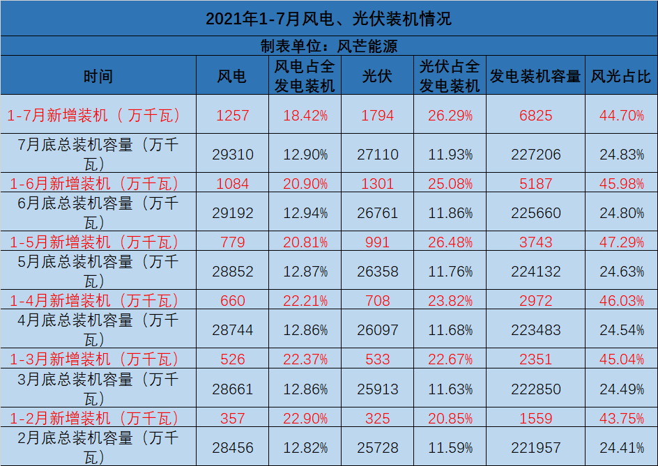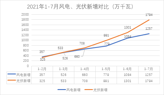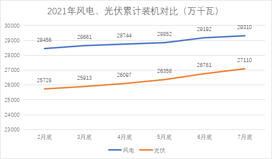 該苗頭對風電來說,值得注意。風電、光伏的暗中賽跑自去年起就一直被大家關(guān)注。風電的新增裝機從今年3月份起就一直落后于光伏。風電與光伏的累計裝機差距也越來越小(7月底累計裝機容量相差2200萬千瓦)。